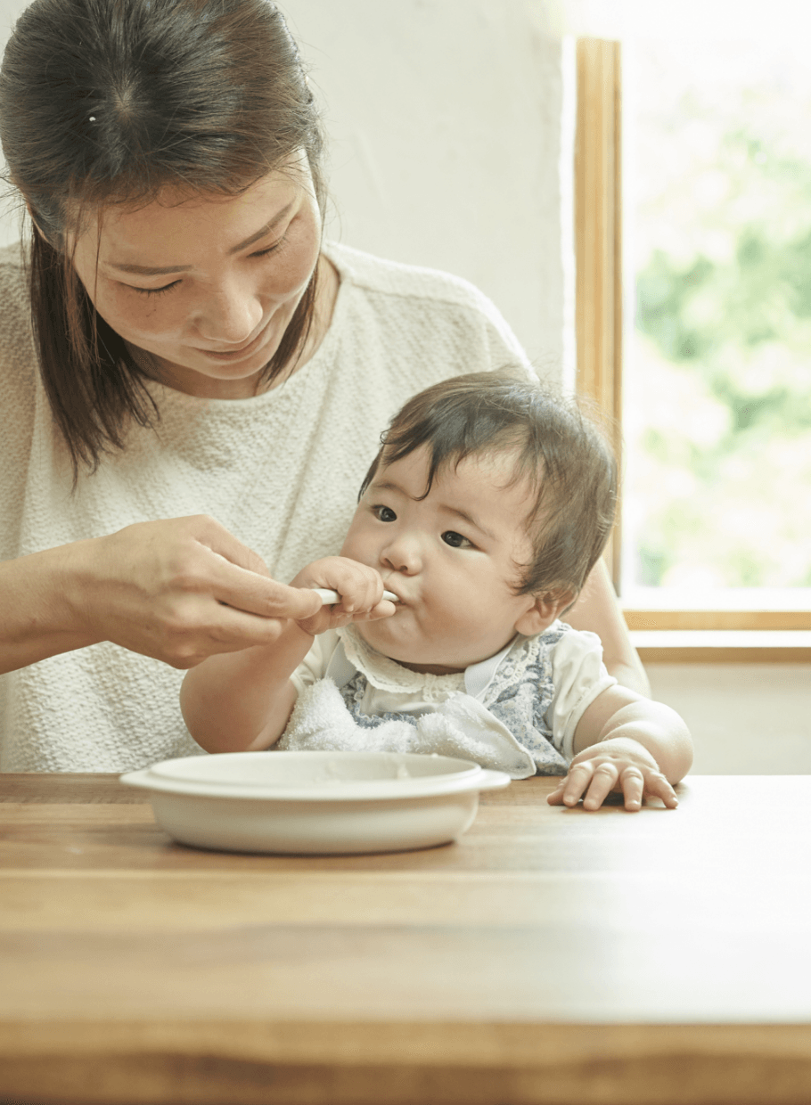 赤ちゃんの地力を育む 親子で使える スプーンセット。  ノコ ベイビースプーンセットは、 親子でいっしょに使えるカトラリーセット。 スプーン3本、カップ、プレートの5点が、 赤ちゃんの成長にそっと寄り添います。  親子で向き合う、毎日のごはん時間。 「どれが食べたい?」「おいしいね」 そんな会話のひとつひとつが、 赤ちゃんの心と体の土台を育ててくれます。  もっと自然に。もっとやさしく。もっと一緒に。 食べる力が、ぐんと育つ毎日を。  Brand Origin  親のためじゃない、 子どものためのスプーンセット。  裏に吸盤がついていてひっくり返らないお皿。 取手やストローがついて、こぼしにくいコップ。 深めのボウルで、食べ物が落ちにくいスプーン。  最近は、親の手間を減らすことを目的としたベビーグッズが 多く見られるようになりました。 共働きの家庭も増え、時間に追われる毎日のなかで、 少しでもスムーズに食事を済ませたい。 それは、ごく自然なことだと思います。  ただ一方で、便利さによって、赤ちゃんの成長に欠かせない「動き」が減ってしまっているかもしれません。 たとえば、お皿を雑に扱えばひっくり返るし、割れてしまうこともある。 そうした経験を通して、「ものを大切にする」気持ちが育まれていきます。 茶碗で飲むときには、手首を使ってバランスを取る動きが自然と生まれます。 取手があると、その動きは必要なくなり、使う筋肉も限定されます。 スプーンもまた、手首の運動や細かい動きを学ぶための大切な道具です。  離乳食期は、授乳期と同じくらい短く、かけがえのない時間。「どれが好き?」と目を合わせて問いかけたり、「おいしいね」と笑い合いながら食べる時間は、赤ちゃんにとっても、親にとっても大切なひとときです。  赤ちゃんがしっかりと食事に集中できる時間は、一回つき10〜15分ほど。 1日3回でも、合計すれば30分程度です。  その短くも豊かな時間を、親子でゆっくり味わってほしい。そんな想いが、このスプーンセットを作るきっかけとなりました。